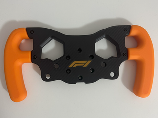 Volante de simulación con diseño inspirado en la Fórmula 1. - Empuñaduras naranjas. - Placa central con logo F1.