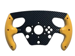 Volante de carreras con diseño inspirado en la Fórmula 1. - Acabado en fibra de carbono. - Empuñaduras ergonómicas en color amarillo.