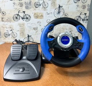 Volante de carreras con pedales. - Diseño en color azul y negro. - Incluye botones de control y palancas. - Base para sujeción.