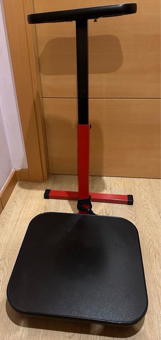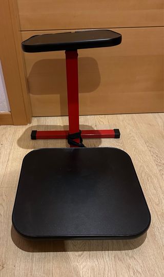 Soporte para volante de gaming, compatible con consolas PS4 y PS5. Su diseño robusto en color negro y rojo ofrece estabilidad. - Base negra. - Estructura de soporte en color rojo. - Correa negra para sujeción.