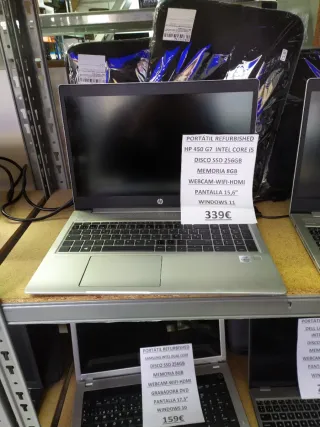 Portátil HP 450 G7 reacondicionado, listo para usar. - Procesador Intel Core i5. - Disco SSD de 256GB. - Memoria RAM de 8GB. - Webcam integrada. - Wi-Fi. - Salida HDMI. - Pantalla de 15,6 pulgadas. - Sistema operativo Windows 11.