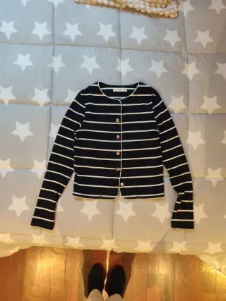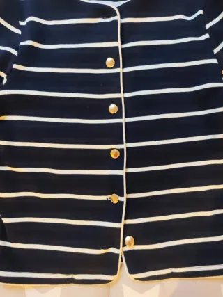 Cárdigan de punto con un diseño clásico de rayas horizontales. Es una prenda versátil y cómoda. - Cierre de botones dorados. - Cuello redondo.