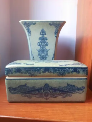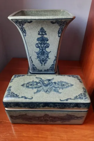 Conjunto vintage de cerámica con un diseño clásico en tonos azul y gris. Incluye un jarrón y un cofre. - Jarrón con base cuadrada y boca expandida. Medidas 15×15×25. - Cofre rectangular con tapa. Medidas 22×11×10. - Decoración detallada en azul sobre fondo grisáceo.