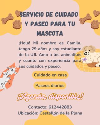 🐾 Cuidado y Paseo de Mascotas – Con cariño y responsabilidad Hola, soy Camila. Si necesitas a alguien de confianza para cuidar o pasear a tu mascota, estoy aquí para ayudarte. Tengo experiencia con perros y gatos, y me encanta dedicarles tiempo, atención y mucho cariño. Ofrezco: • Paseos adaptados a la energía y necesidades de tu mascota. • Cuidado en casa del dueño: alimentación, juego, compañía y supervisión. • Actualizaciones y fotos para que estés tranquilo en todo momento. Tu peludito estará en manos responsables, con una persona paciente, atenta y amante de los animales. 💛 Si deseas información, no dudes en contactarme.