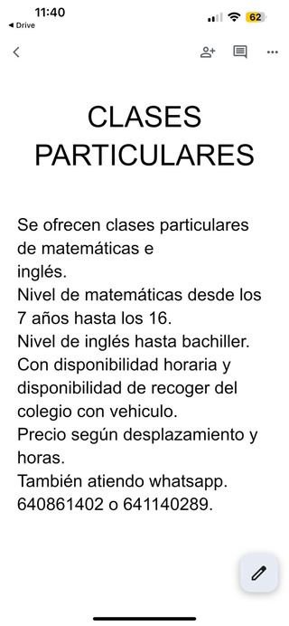 Se ofrecen clases particulares de matemáticas e inglés. Nivel de matemáticas desde los 7 años hasta los 16. Nivel de inglés hasta bachiller. Con disponibilidad horaria. Precio según desplazamiento y horas. También atiendo whatsapp. 641140289 ANIMATE A PREGUNTAR SIN COMPROMISO!🫶🏻