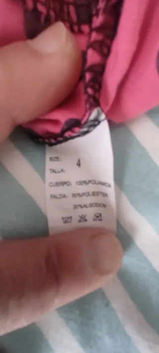 Vestido de flamenca para niña, - Cuerpo negro. - Falda rosa con lunares negros y volantes. - Mangas abullonadas. - Adorno de flecos en el escote.