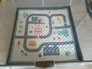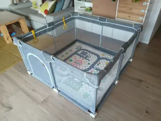 Parque infantil seguro y espacioso para que los más pequeños jueguen y exploren. 120x120x60. - Estructura de tela resistente con paneles de malla. - Incluye alfombra acolchada con diseño. - Puerta con cremallera para fácil acceso. - Asas de seguridad para ayudar a levantarse. La alfombra tiene una pequeña mancha y en la parte de la cremallera los embellecedores están rasgados.
