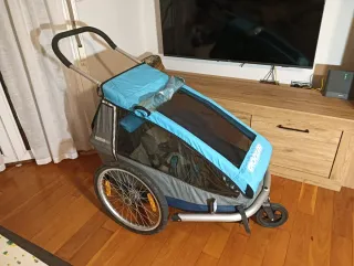 Remolque Croozer para transportar un niño. - Color azul y gris. - Ruedas de 20 pulgadas. - Capota con protección para lluvia. - Kit para running. - Dos enganches para la bici (no salen en las fotos) - Hamaca para bebes recien nacidos (no sale en las fotos).