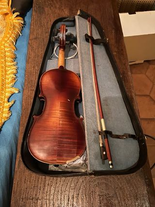 Instrumento musical de cuerda, un violín listo para ser tocado. - Incluye funda protectora. - Se acompaña de arco para tocar.