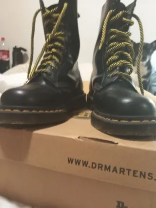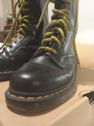 Botas Dr. Martens de cuero negro, sin estrenar. Incluyen cordones amarillos y negros. - Modelo alto. - Cierre de cordones. - Suela con pespunte amarillo característico.
