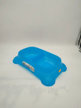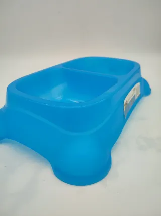 Comedero doble de plástico para mascotas. Ideal para separar la comida y el agua. - Fabricado en plástico resistente. - Diseño con dos compartimentos. - Base estable para evitar vuelcos.