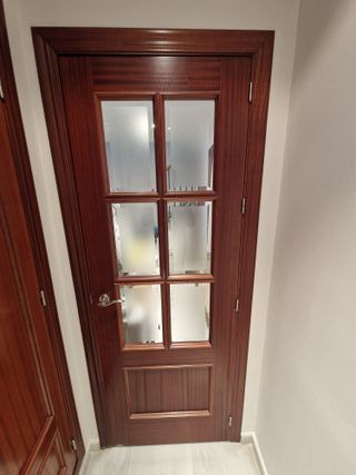Puerta de madera con diseño de cristales. - Marco de madera oscura. - Paneles de cristal esmerilado. - Tirador metálico.