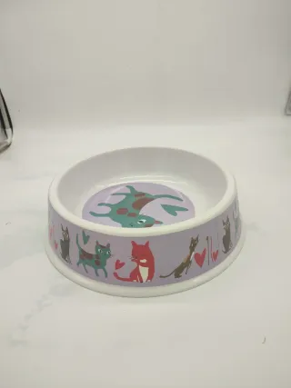 Comedero para gatos con un divertido diseño de gatitos y corazones. - Diseño exterior con varios gatos y corazones. - Dibujo interior de un gato morado con manchas.