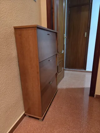 Mueble zapatero de diseño moderno y elegante. - Acabado en madera de tono marrón. - Tres compartimentos abatibles para guardar calzado.