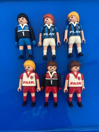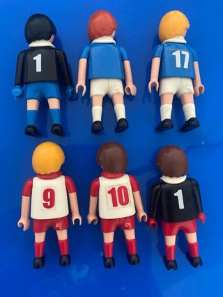 Seis muñecos Playmobil con temática de fútbol, listos para la acción en el campo. - Tres muñecos con camisetas azules y blancas. - Tres muñecos con camisetas rojas y blancas. - Diseños variados de uniformes y dorsales.