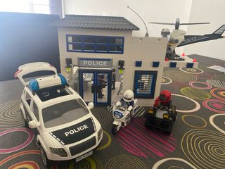 Set de juego de la comisaría de policía de Playmobil, incluye varios vehículos y figuras. - Comisaría con detalles. - Coche de policía con luz y sonido. - Moto de policía. - Helicóptero de policía. - Quad. - Figuras de policía.