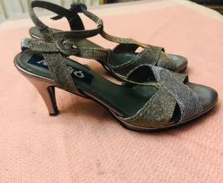 Elegantes sandalias de tacón, perfectas para el verano. - Diseño con tiras cruzadas y detalle brillante. - Tacón fino y pulsera al tobillo con cierre de hebilla. - Acabado metalizado en tonos dorados y plateados.