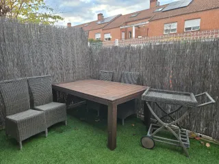 Conjunto de mobiliario de exterior para tu jardín o terraza. - Mesa de madera con estructura oscura. - Cuatro sillas de mimbre con respaldo alto, 3 de ellas estan un poco deterioradas por arriba. Son muy comodas. - Carrito auxiliar con ruedas y bandeja. -Regalo cojines a medida.