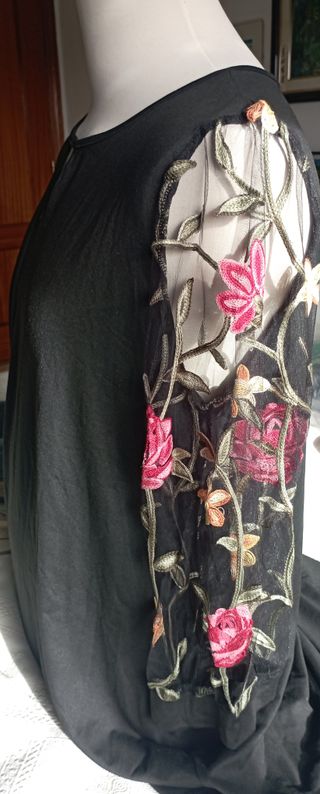 Elegante vestido negro con mangas transparentes bordadas. Hombros 42 cm Axilas 56 Largo central 104 - Mangas transparentes con bordado floral. - Detalle de flores en tonos rosas y anaranjados. - Corte asimétrico en el bajo.