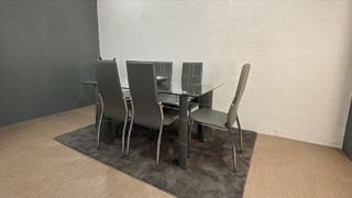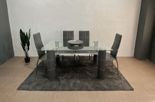 Conjunto de mesa de comedor extensible con seis sillas a juego. El diseño moderno se adapta a cualquier espacio. HACEMOS ENVÍOS +INFO LLAMA O ESCRIBENOS +34 600**473**941 ✅Producto nuevo ✅Paga en casa