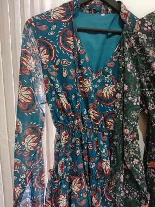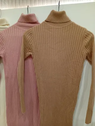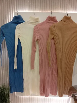 Conjunto de cuatro vestidos de punto con cuello alto. Dan talla desde la L hasta la XXL. Se venden también por separado a 5€ unidad - Diseño de canalé. - Manga larga. - Largo midi