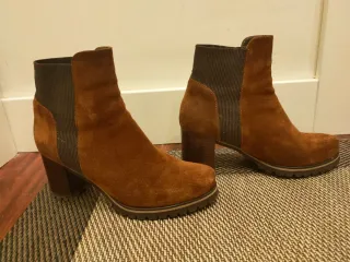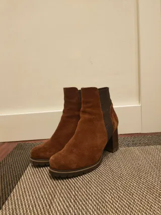 Botas de ante de la marca Pedro Miralles. - Color marrón. - Tacón grueso. - Detalle elástico en el lateral.
