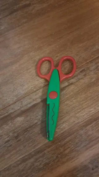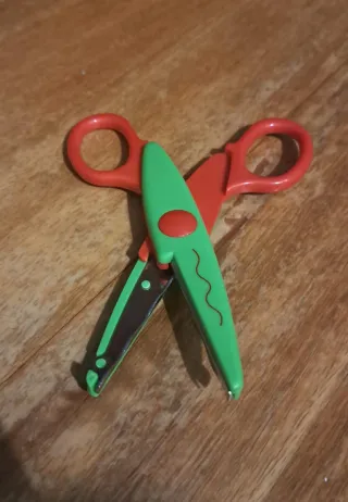 Tijeras escolares con diseño de corte ondulado, ideales para manualidades y proyectos creativos. En perfecto estado y sin uso.