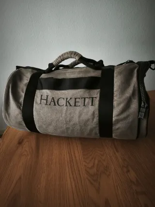 Práctica bolsa de viaje de la marca Hackett. Ideal para escapadas cortas o para llevar al gimnasio. - Diseño bicolor en beige y negro. - Asas superiores reforzadas. - Cierre de cremallera. - Correa lateral para colgar al hombro.