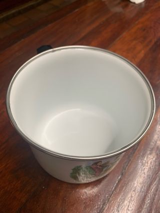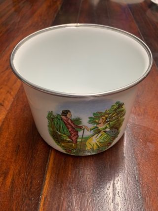 Cazo de leche con un diseño encantador y un toque vintage. Presenta una escena romántica pintada a mano en su exterior, añadiendo un detalle artístico. - Diseño con escena romántica. - Acabado exterior detallado. - Mango negro