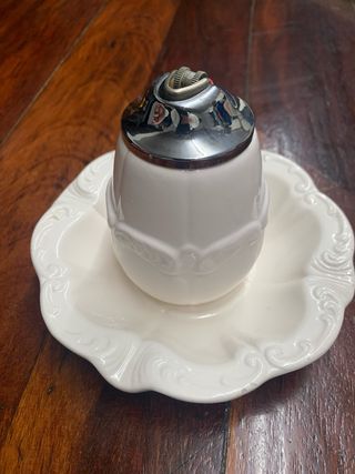 Conjunto de mechero y cenicero de cerámica blanca con un diseño elegante. - Cenicero con borde decorativo. - Mechero con tapa metálica cromada.