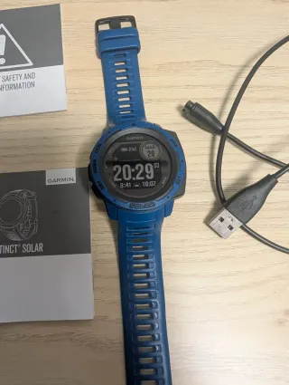 Reloj inteligente Garmin Instinct Solar en color azul marino. Se encuentra en perfecto estado, listo para su uso. Muy poco uso - Incluye caja original. - Manual - Cable de carga USB.