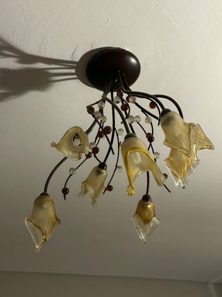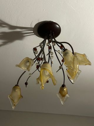 Elegante lámpara de techo con un diseño inspirado en flores. Sus brazos curvos y detalles de cuentas le dan un toque artístico. - Acabado en tonos marrones y transparentes. - Combina cristal y metal en su fabricación.