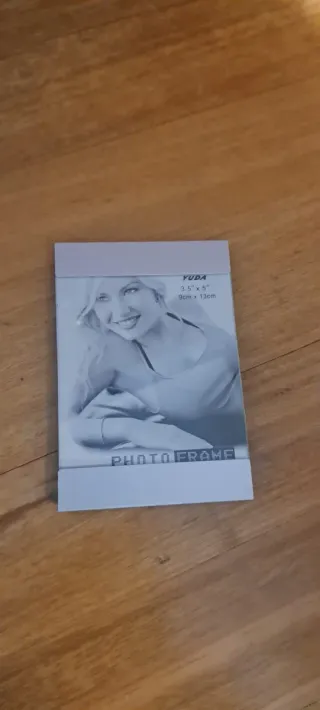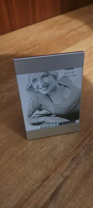Marco de fotos con un diseño moderno y elegante. - Tamaño 9x13cm - Acabado plateado en los bordes y trasera efecto terciopelo. - Con pie para colocar en vertical o horizontal En perfecto estado
