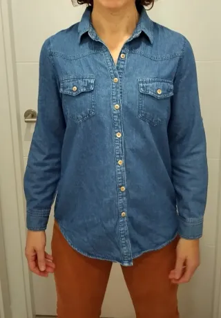 Camisa vaquera azul en tejido denim ligero de manga larga para mujer, diseño clásico con canesú frontal, dos bolsillos con botón y cierre delantero abotonado. TS de la marca Shimai. Impecable