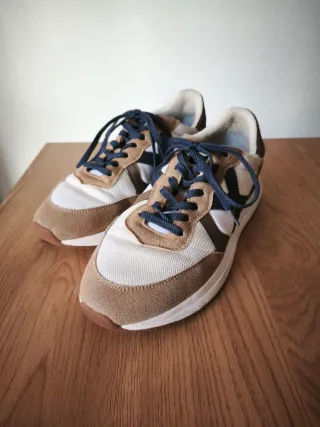 Zapatillas de la marca Munich con un diseño moderno y cómodo. - Combinación de colores marrón y blanco. - Detalle de la X característica de la marca en azul marino. - Cordones de color azul marino.