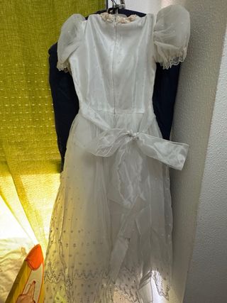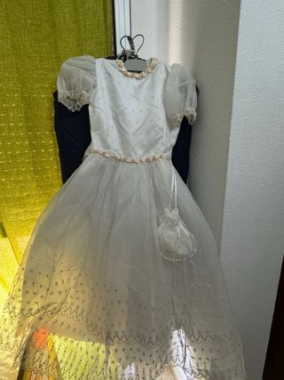 Elegante traje de comunión en color blanco. De estar guardado las mangas esta algo amarilla que una de tintorería y listo. - Cuerpo del vestido con pequeños detalles. - Mangas abullonadas de organza. - Falda con tul y adornos florales. - Incluye un pequeño bolso a juego.