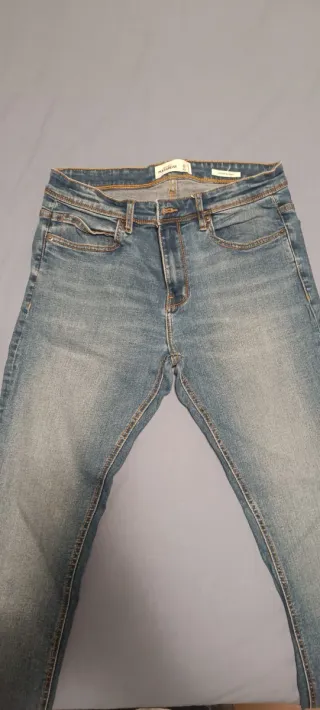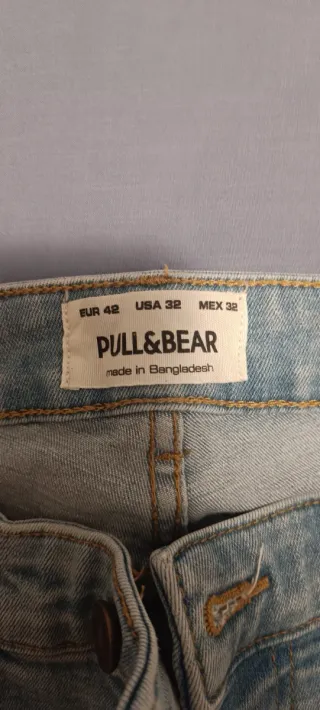Vaqueros de la marca Pull&Bear en color azul. - Corte moderno y favorecedor. - Diseño clásico de cinco bolsillos. - Cierre de cremallera y botón. - Costuras visibles en contraste.