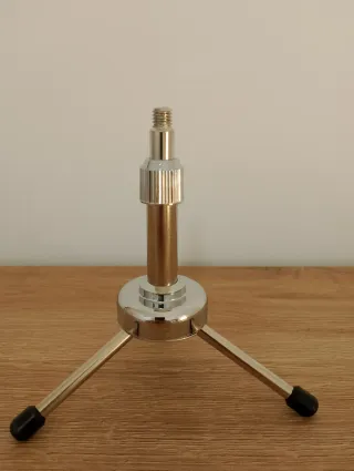 Trípode compacto con acabado metálico plateado. - Base de tres patas con puntas de goma negra. - Columna central ajustable en altura. - Rosca superior estándar para montaje.