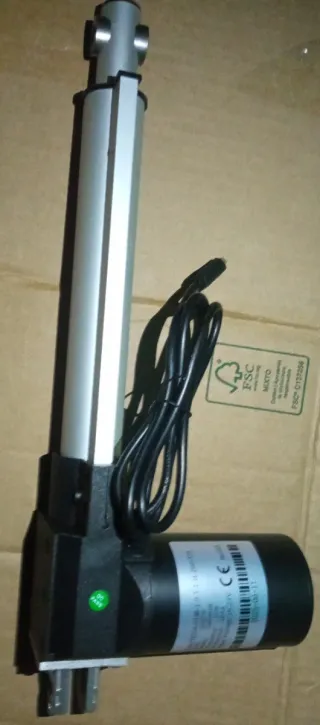 Actuador lineal eléctrico con motor de 12V. Ideal para diversas aplicaciones. - Cuerpo principal de aluminio. - Conector de cable negro. - Indicador LED verde.