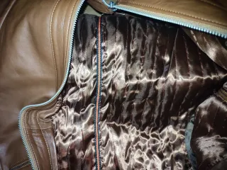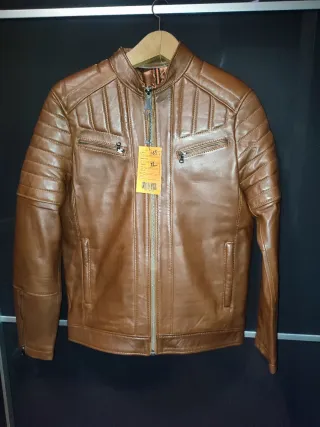 Chaqueta de cuero con un diseño moderno y elegante. - Material: Cuero - Color: Marrón - Cierre de cremallera frontal - Bolsillos con cremallera en el pecho - Cuello alto - Diseño acolchado en hombros y mangas