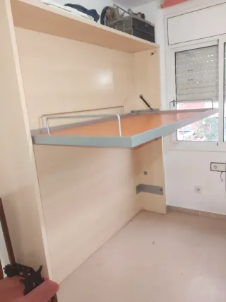 Cama abatible con un diseño moderno y funcional. Se tiene que venir a desmontar, urge - Panel frontal en color naranja. - Estructura principal en tono beige. - Combina materiales de madera y metal.
