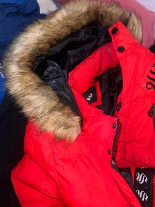 Chaqueta de invierno con capucha y detalles en pelo sintético. - Cierre de cremallera y botones. - Forro interior negro. - Diseño acolchado.