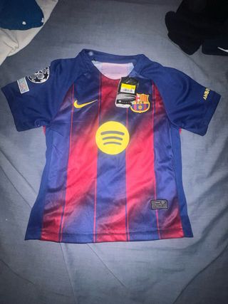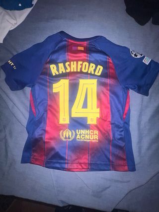 Camiseta oficial del FC Barcelona, talla 20. Diseño a rayas rojas y azules. SIN ESTRENAR - nombre en la parte de atras RASHFORD - numero en la parte de atras 14 - Logo de Nike bordado. - Escudo del FC Barcelona. - Patrocinador Spotify en la parte frontal. - Parche de la Champions League en la manga. - Detalle AMB en la manga.