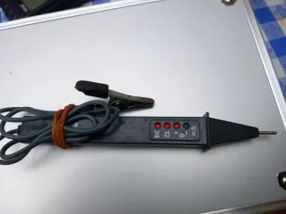 Comprobador de voltaje para sistemas de 12V. - Indicadores LED para diferentes voltajes. - Pinza de conexión para tierra. - Punta de prueba para mediciones.