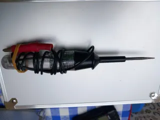 Herramienta para comprobar circuitos de 12V. - Cuerpo metálico. - Pinza tipo cocodrilo para conexión. - Cable enrollado y sujeto con goma.