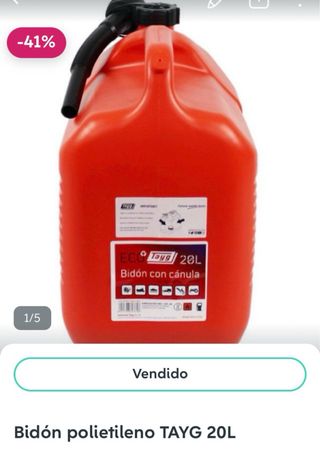 Se venden 5 bidones de la marca Tayg, cada uno con capacidad de 20 litros y cánula. - Capacidad: 20 L cada uno. - Incluyen cánula para facilitar el vertido. - Marca: Tayg. - Material: Plástico resistente.