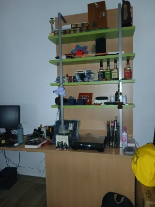 Escritorio Merkamueble con estantería integrada. Un mueble funcional para tu espacio. Venta en persona. - Amplia superficie de trabajo. - Estantería para organización. Zapatero bajo estantería.