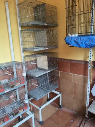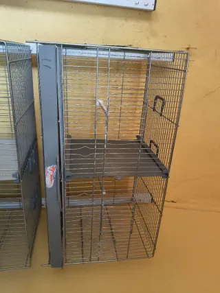 Carrito con cuatro jaulas apilables, ideal para tener a tus pájaros organizados. - Estructura metálica. - Bandejas extraíbles para facilitar la limpieza. - Con sus posaderos , su rejilla y su transportador opaco ( rejilla y/o transportador faltan algunos) pero hay para todas las jaulas transportador o rejilla