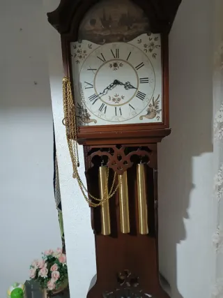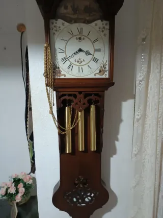 Elegante reloj de péndulo antiguo con detalles dorados. - Mecanismo de péndulo visible. - Cadena decorativa dorada. - Tres pesas doradas colgantes. - Diseño clásico con ornamentos florales.