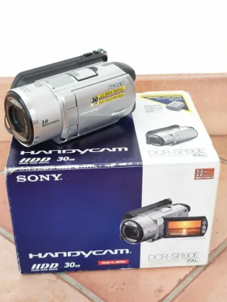 Videocámara Sony Handycam DCR-SR90E con disco duro de 30GB. Con grabación de sonido Dolby 5.1 ch surround y pantalla LCD tactil. Se encuentra en perfecto estado con su caja y todos sus accesorios: instrucciones, mando a distancia, cargador, cable USB, cable RCA. Además, de regalo, batería de repuesto, bolsa de transporte con bandolera y correa para el cuello.